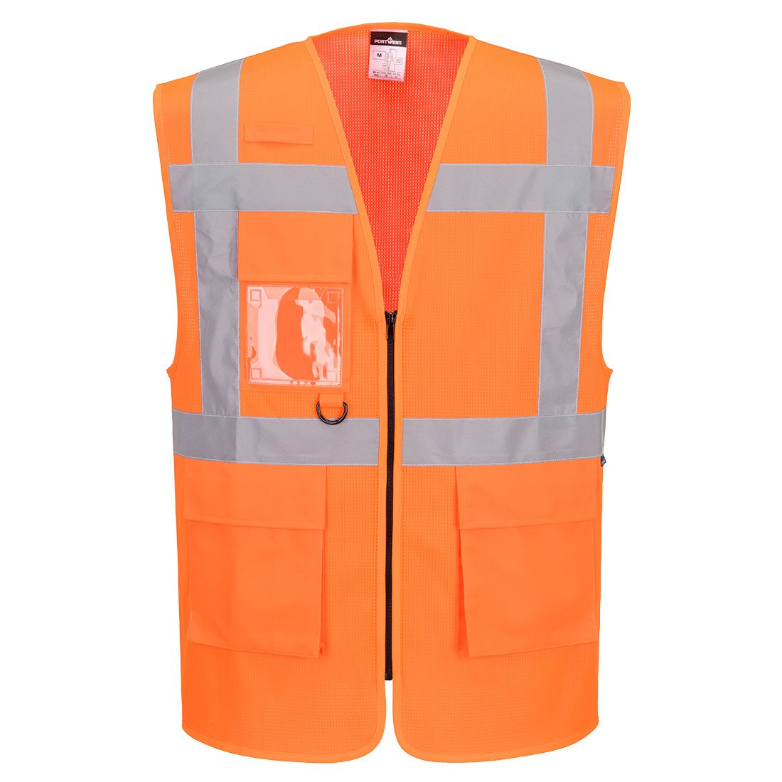 Descoperiți Vesta Executivă Essential Hi-Vis din plasă, concepută pentru a asigura vizibilitate maximă și confort. Această vestă integrează tehnologia avansată MeshAir, garantând o ventilație excelentă pentru a menține utilizatorul răcoros în orice moment. Materialul MeshAir este pe deplin conform cu standardul EN ISO 20471, asigurând conformitatea cu cerințele de siguranță. Pe lângă performanța superioară, vesta include caracteristici executive clasice, precum multiple buzunare, suport pentru ID, buclă pentru radio și închidere cu fermoar frontal pentru acces facil și practicabilitate.